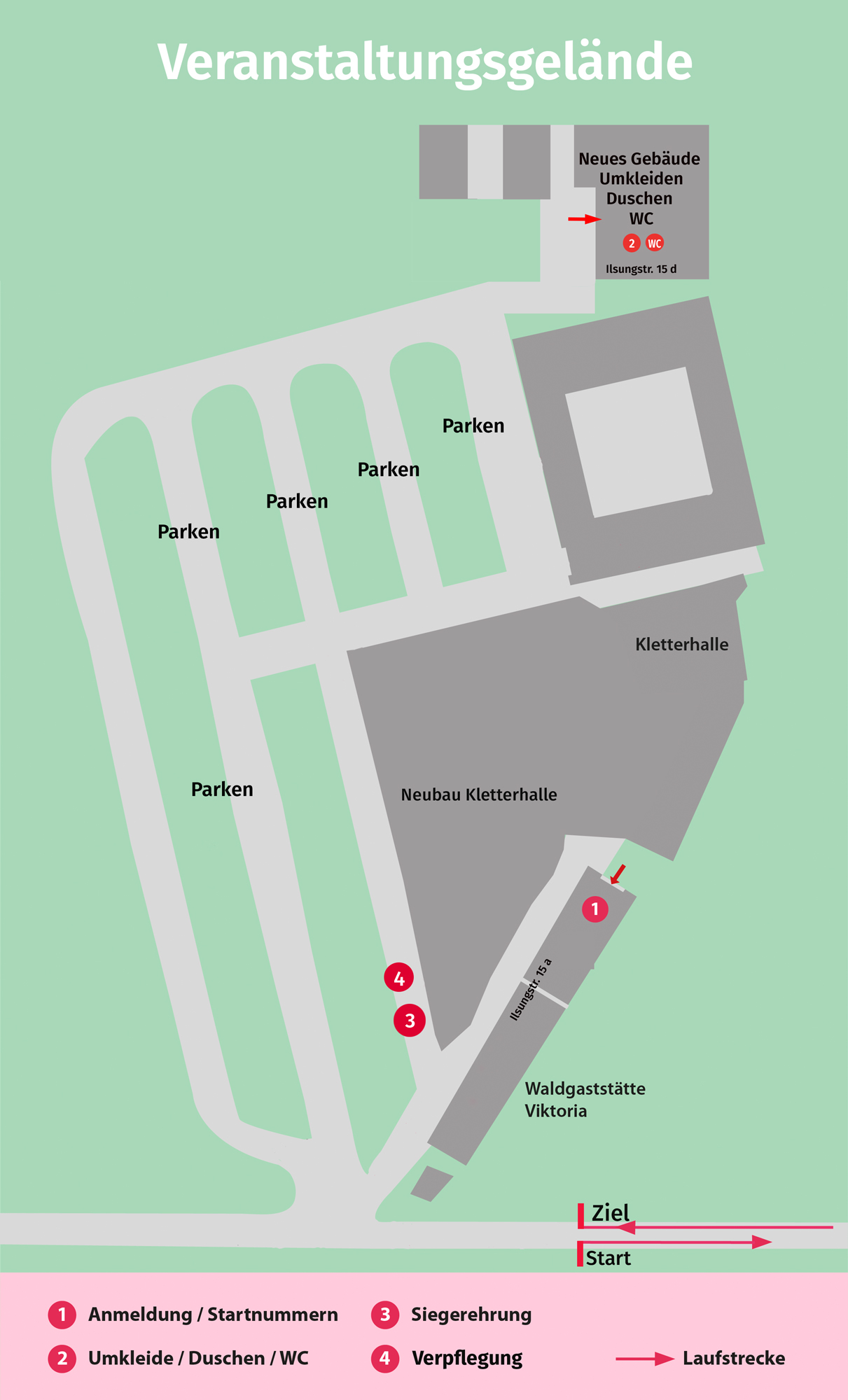 Die Siegerehrung findet im Verpflegungsbereich im Freien, bei Regen in der TGVA-Gymnastikhalle (Startnummernausgabe), statt.